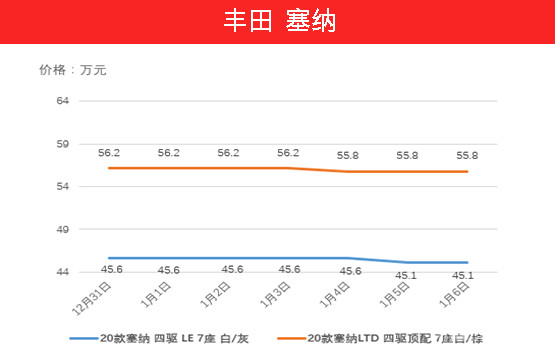 在完全失去一线城市市场后,塞纳可以说再也回不去以往的价格了。上周迫于库存压力,其两款主力车型均有所下跌,其中四驱 LE 7座车型下降5000元,顶配车型下降4000元。