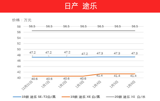 作为近两年的黑马车型,凭借着极强的性价比,日产途乐在节假日期间总会有不错的销量。上周日产途乐的价格有所上涨,XE白/黑表现最为明显上涨8000元,SE-T2车型上涨1000元,20款全新途乐的价格依然没有变化。